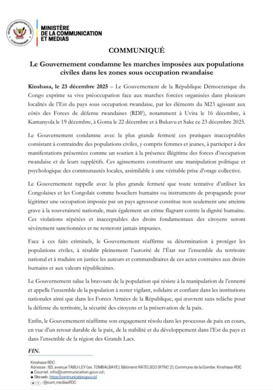 Avec fermeté, le Gouvernement a condamné les marches imposées aux populations civiles dans plusieurs localités de l’Est du pays sous occupation rwandaise, via, selon Kinshasa, ses supplétifs de l’AFC-M23. Dans un communiqué publié à Kinshasa ce mardi 23 décembre 2025, l’Exécutif congolais dit exprimer sa vive préoccupation face à ces actions attribuées aux éléments du M23, qui opèrent aux côtés des Forces de défense rwandaises.